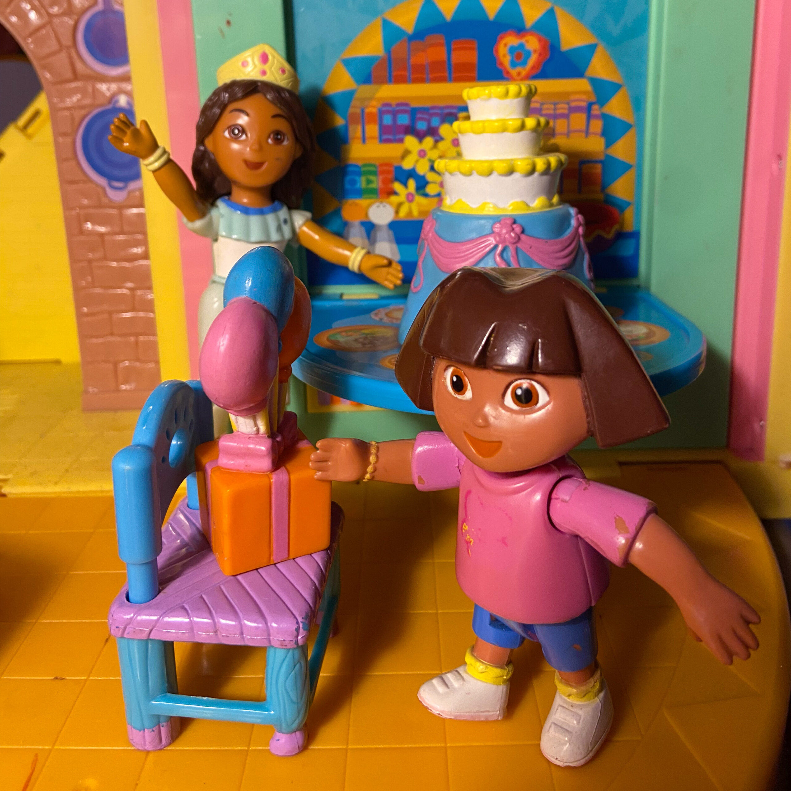 This figurine is Cousin Daisy, who is a sister to Diego. She was a minor character in the show but was an add-on to the Dora Playhouse set. She can move at the hips and her knees too. She wears a birthday crown, a ruffled shirt, white pants, and loafers to coincide with her outfit.