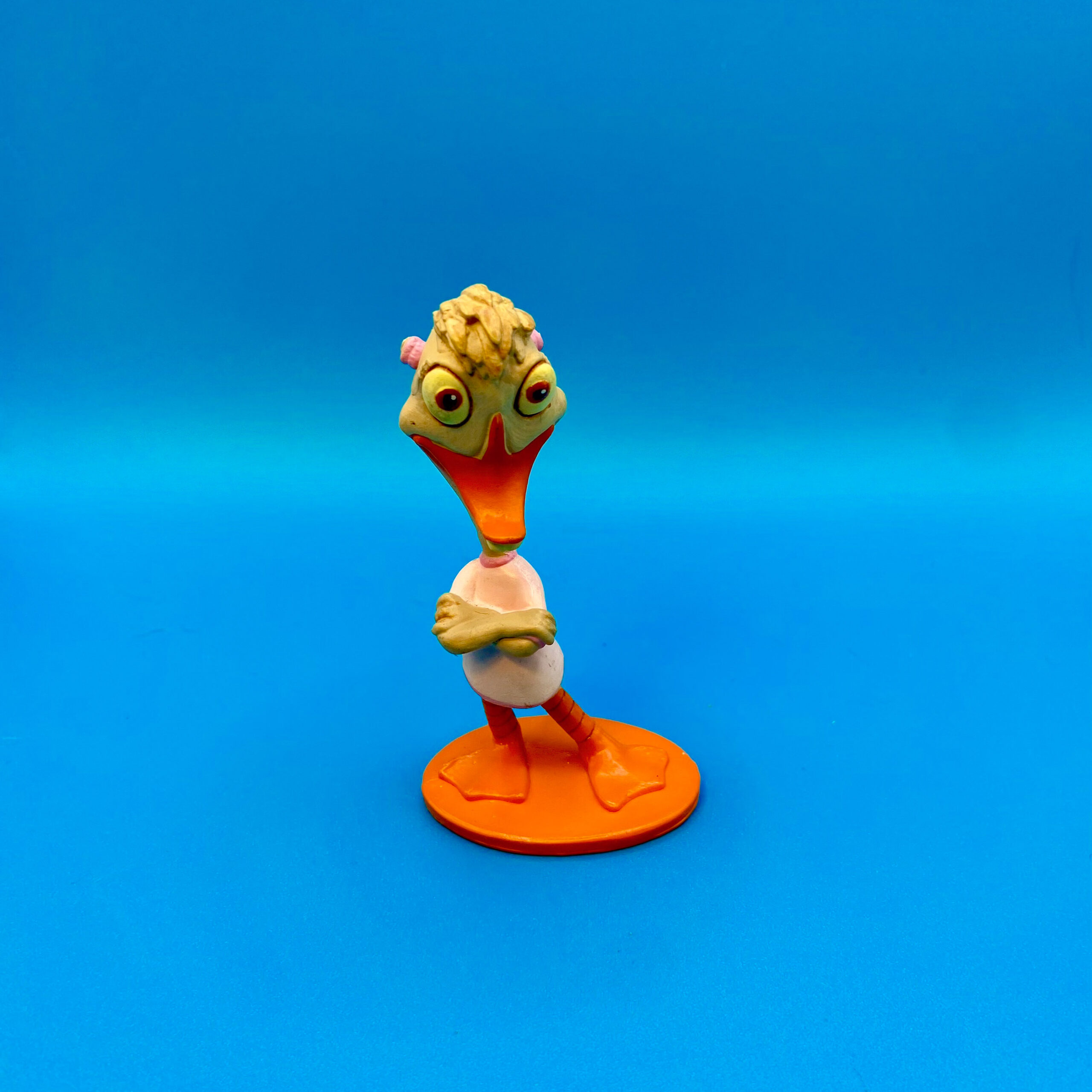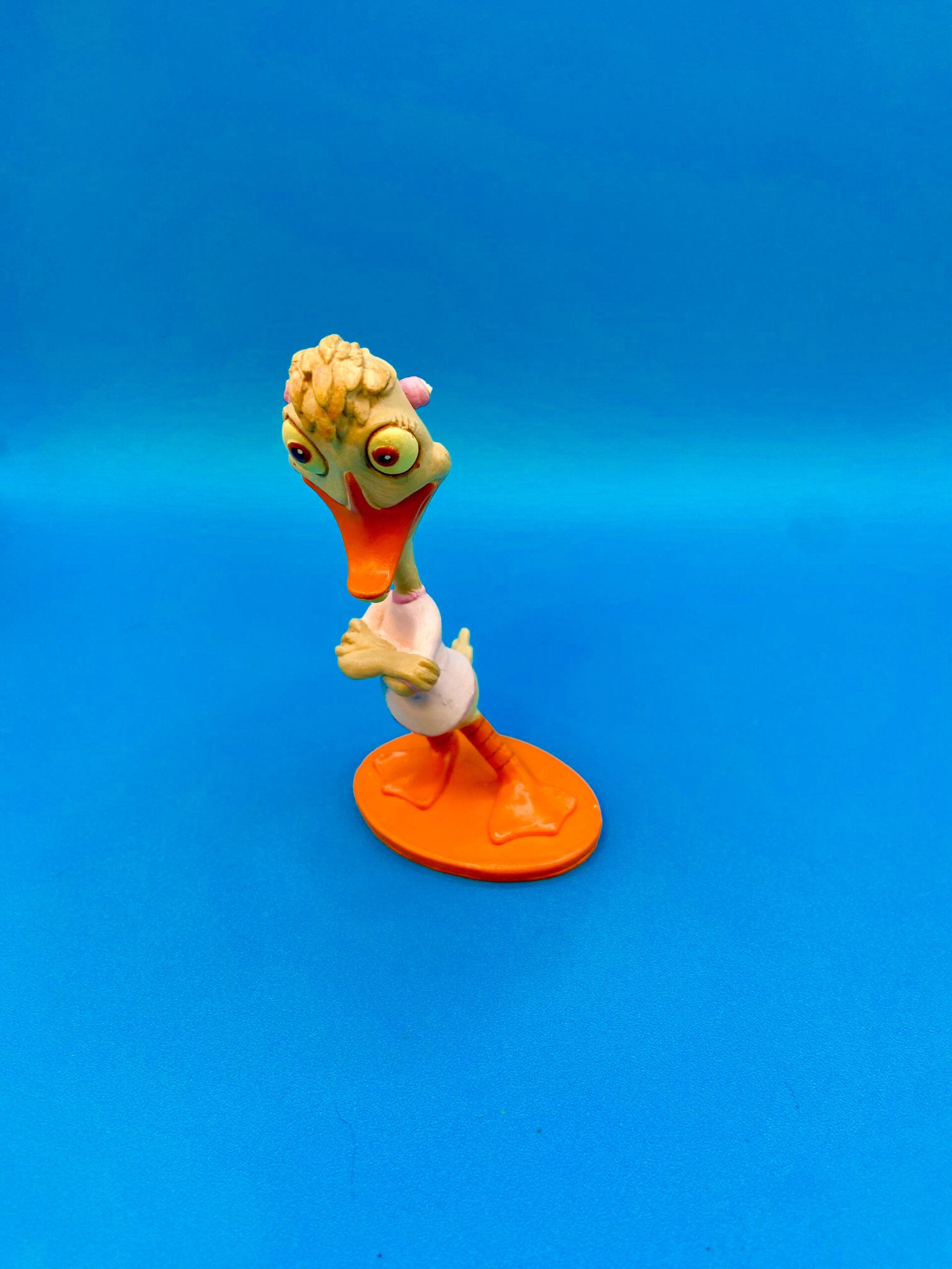 Abby Mallard is the perfect addition to the Chicken Little crew as being the best friend of Chicken Little in the movie. She was nicknamed the “Ugly Duckling” in a loving way, and that matches the figurine’s current condition. Abby Mallard is wearing her pink shirt and pink scrunchies in her hair and is in a sassy stance. This is a PVC toy made of polyvinyl chloride, which is found in most collectible toys.