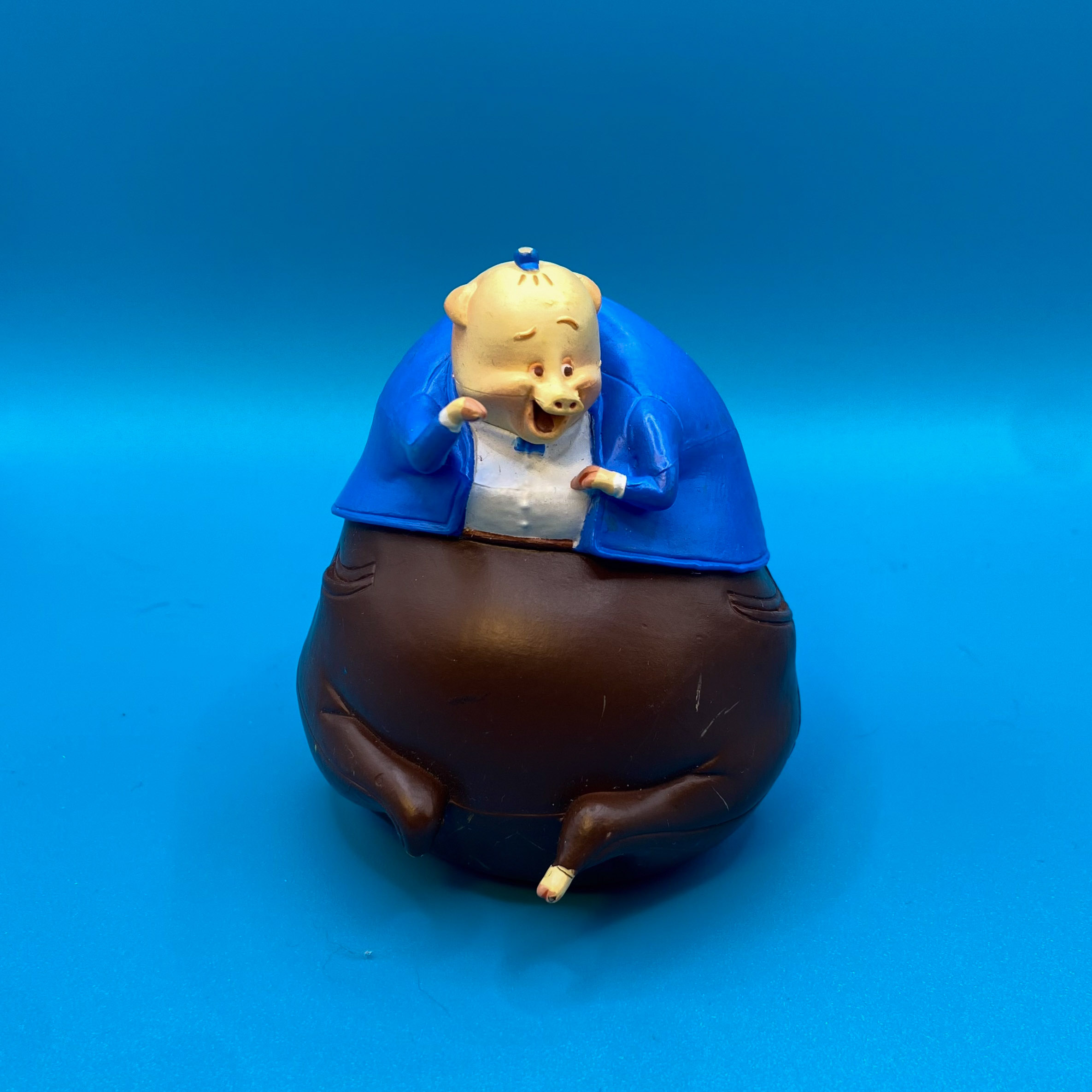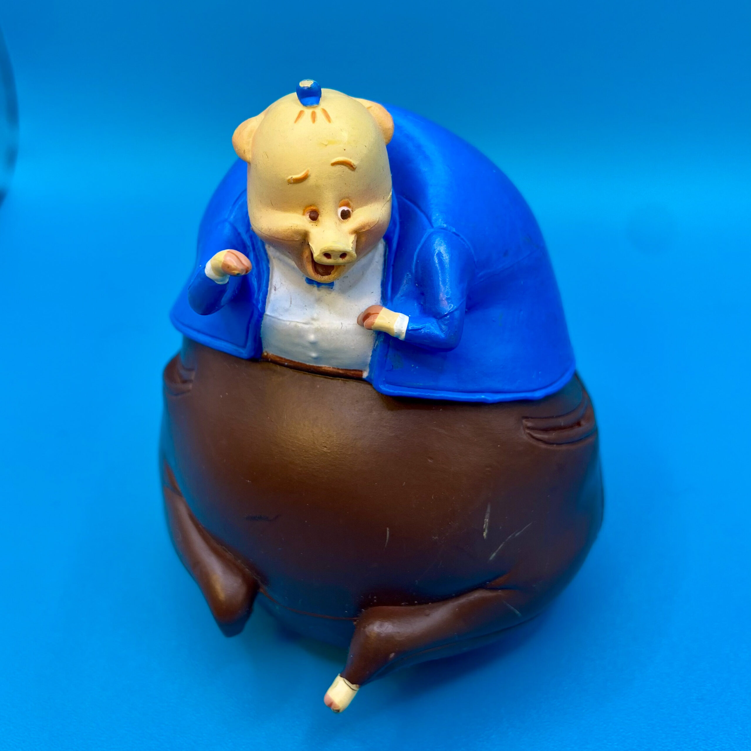 Runt of the Litter is an iconic character from the Chicken Little movie and was featured in the Disney franchise that could be bought from the Disney Stores that used to be in malls across America. Runt is wearing his blue jacket and white button-up shirt from the movie and his little blue hat. This is a PVC toy made of Polyvinyl chloride, which is found in most collectible toys.