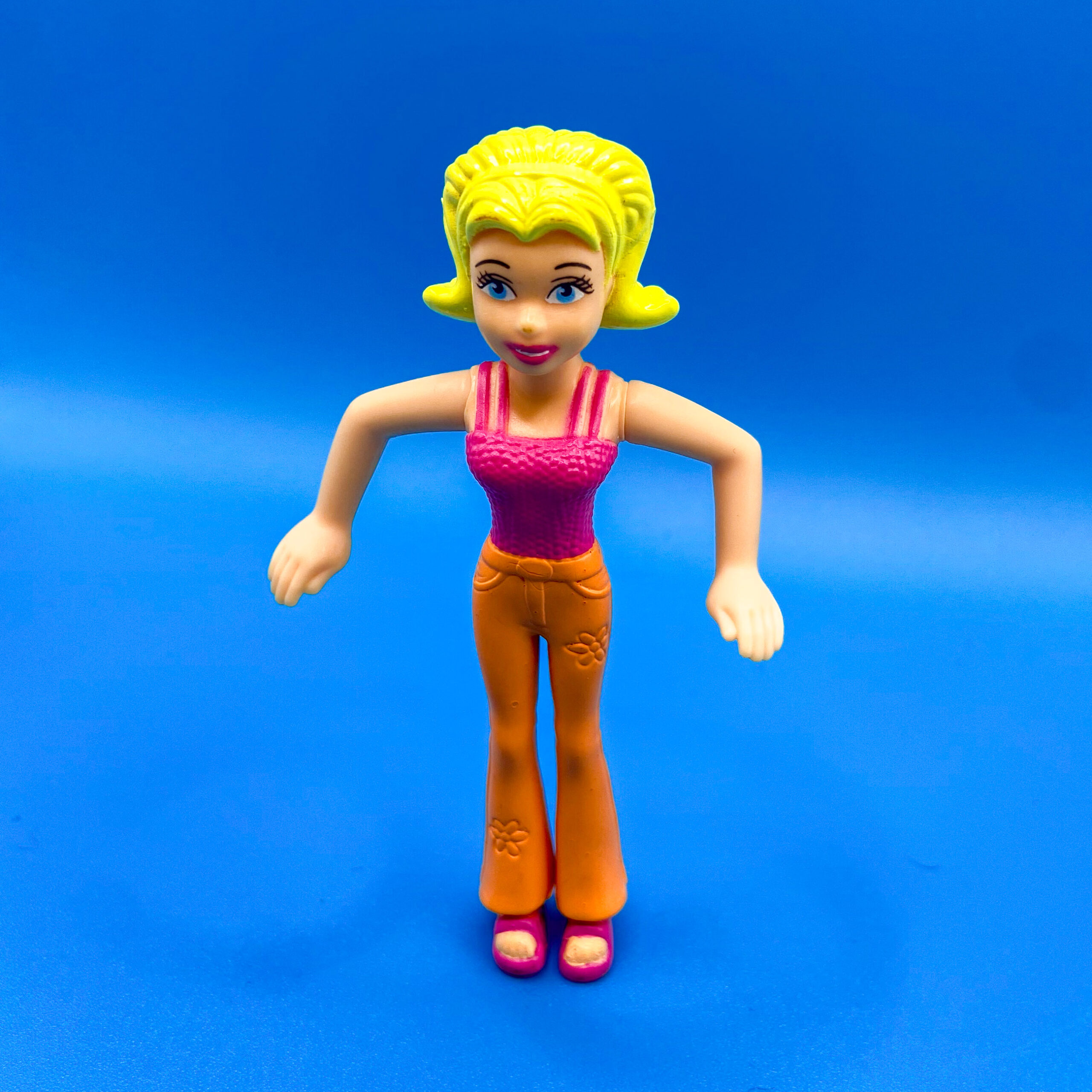 Polly is from a 2006 line of McDonald’s Happy Meal toys for the Pollyworld movie. She has short blonde hair, a pink tank top, and orange pants.