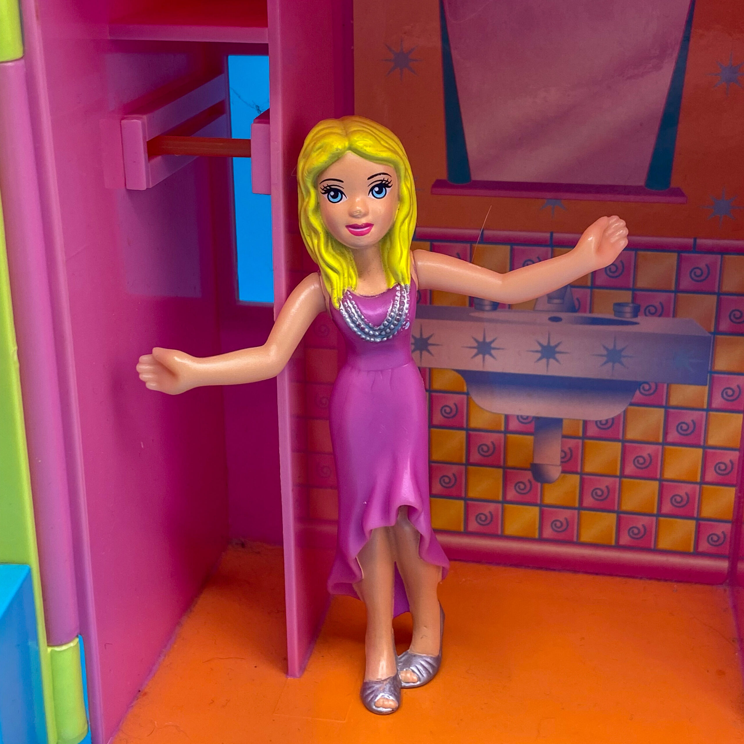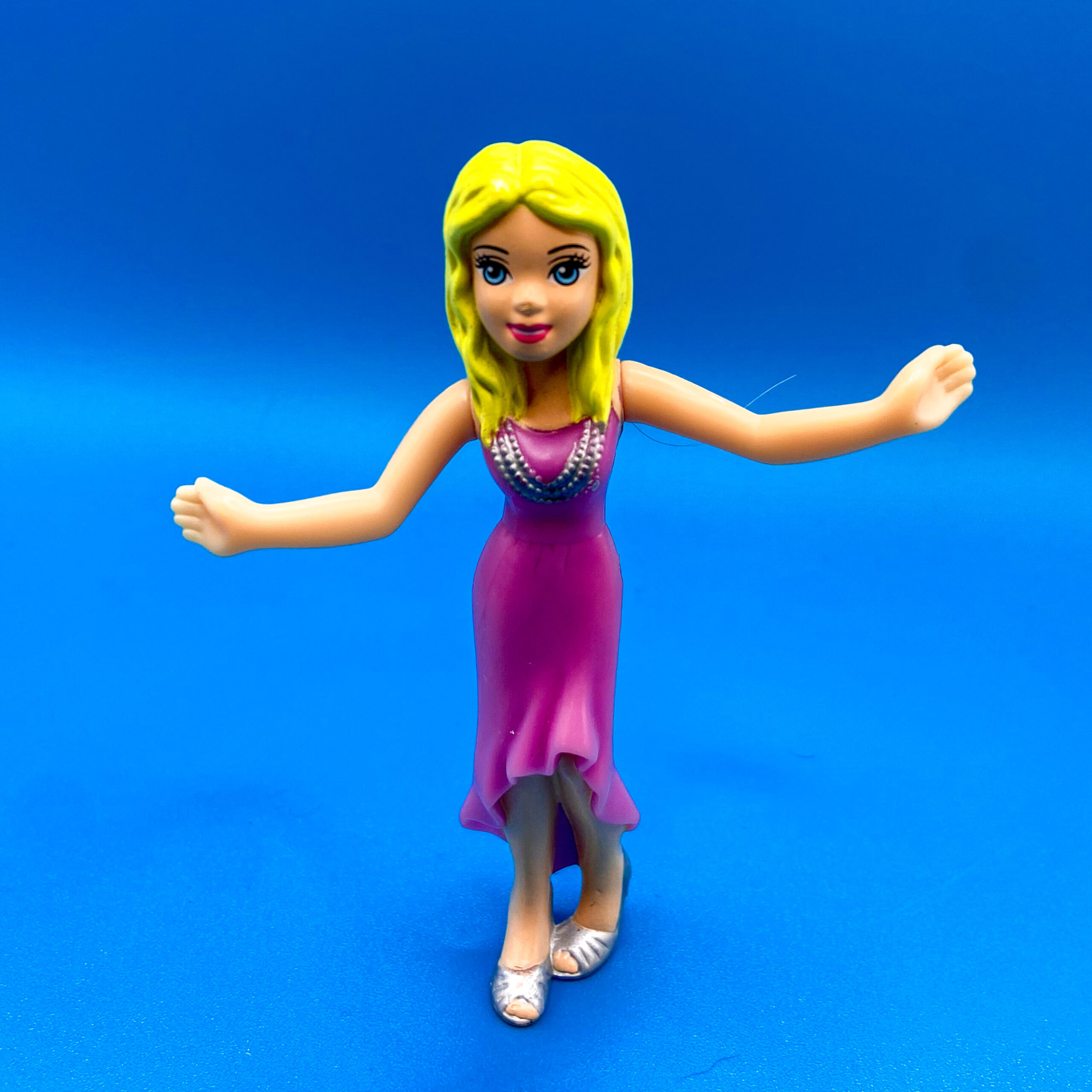 Polly is from a 2008 Polly Pocket line of McDonald’s Happy Meal toys. She has long blonde curly hair and wears a long purple dress with a silver necklace.