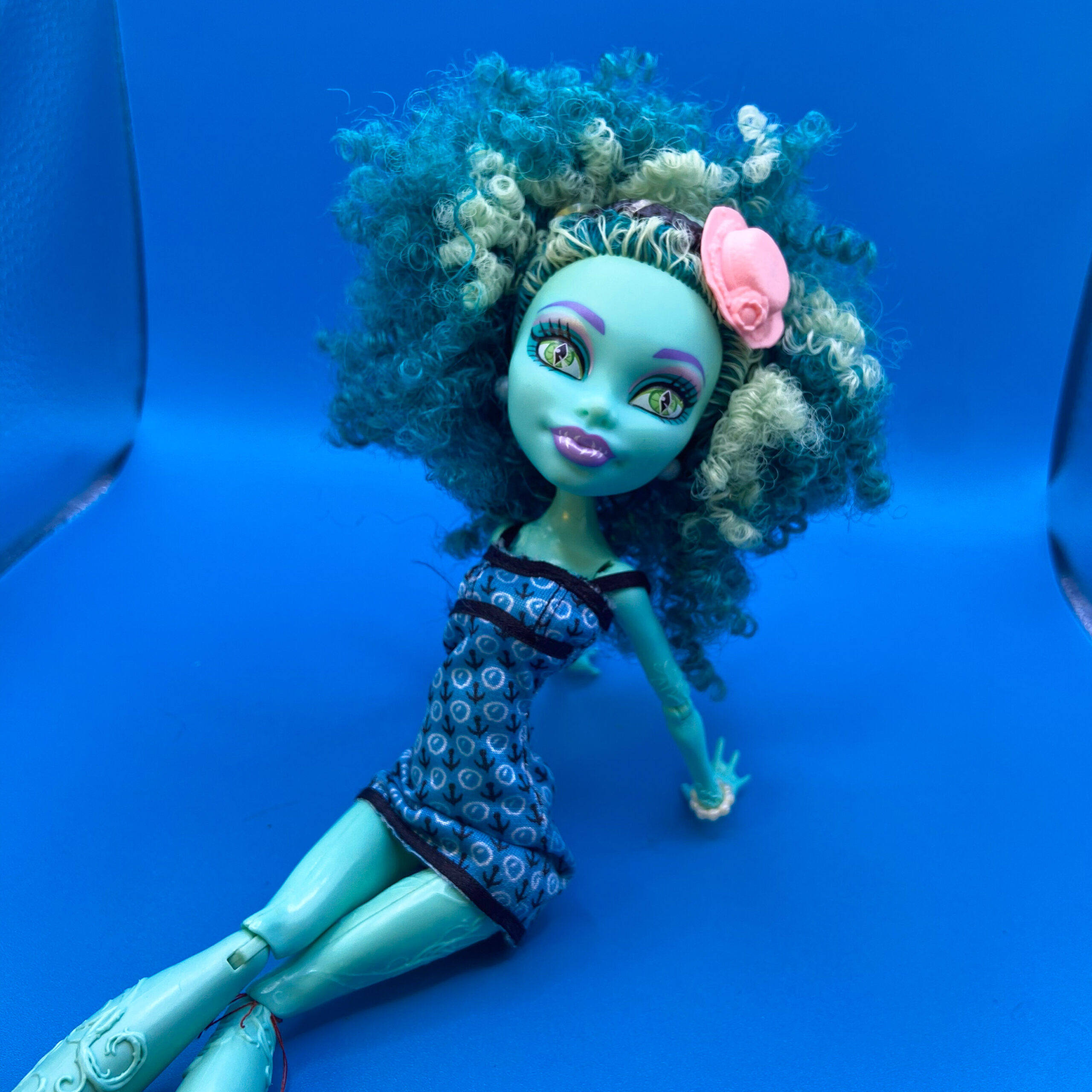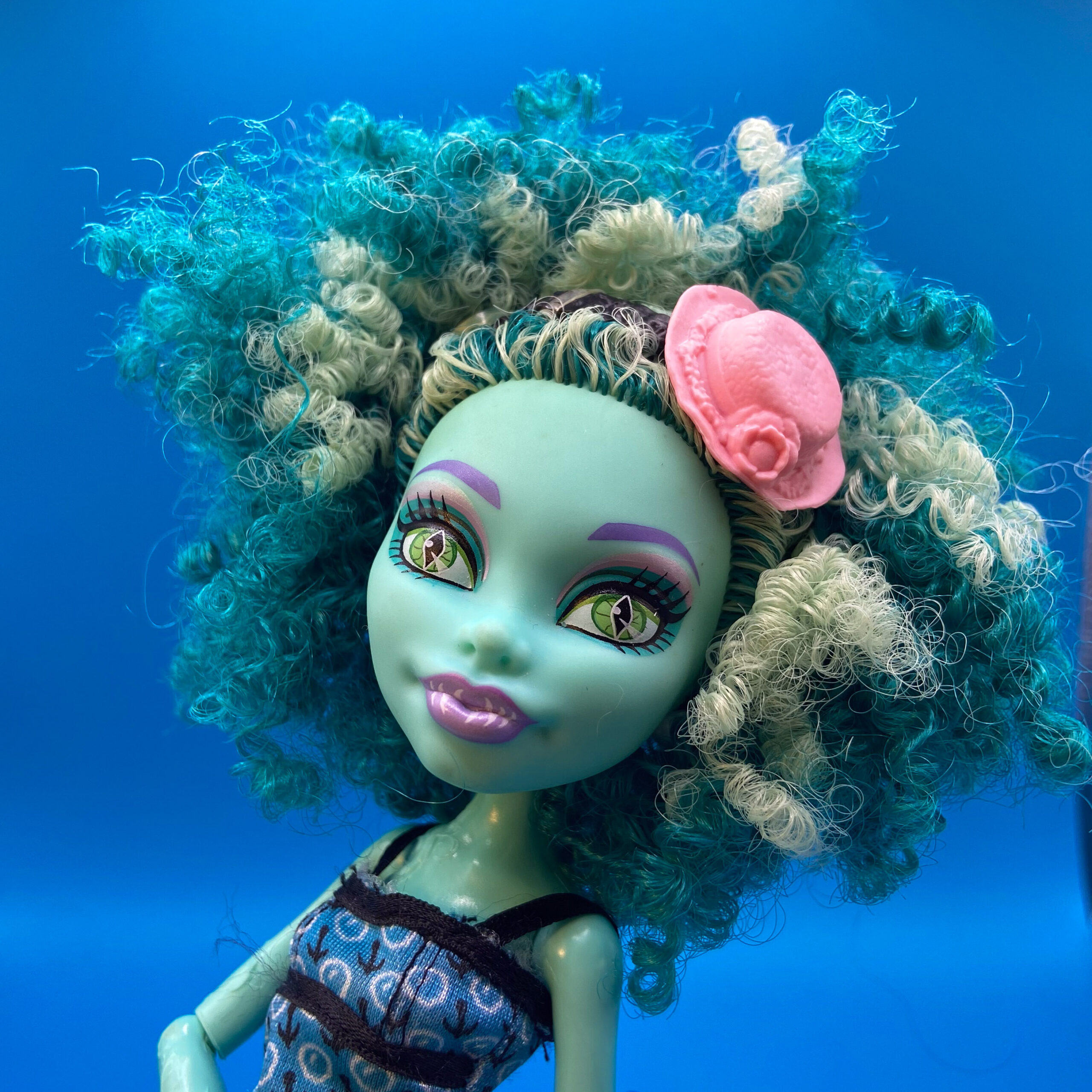 Honey Swamp is one of my sisters and I’s favorite dolls due to her fun hair texture and the detail put in to her makeup. We also enjoyed the Island Swamp Monster story behind her as a character. She is not wearing her original outfit but another Monster High Dolls Clothes.